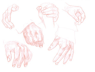 Hands are hard to draw. Much continued practice is required. That's all there is to it. I'm always looking for good hand reference. I can find it in magazines or my wife's crafting and gardening books and of course there are the ones I'm using to type this post. There is no shortage of hands around here, only a shortage of the drawing of hands. In fact, I should probably do some more tomorrow !