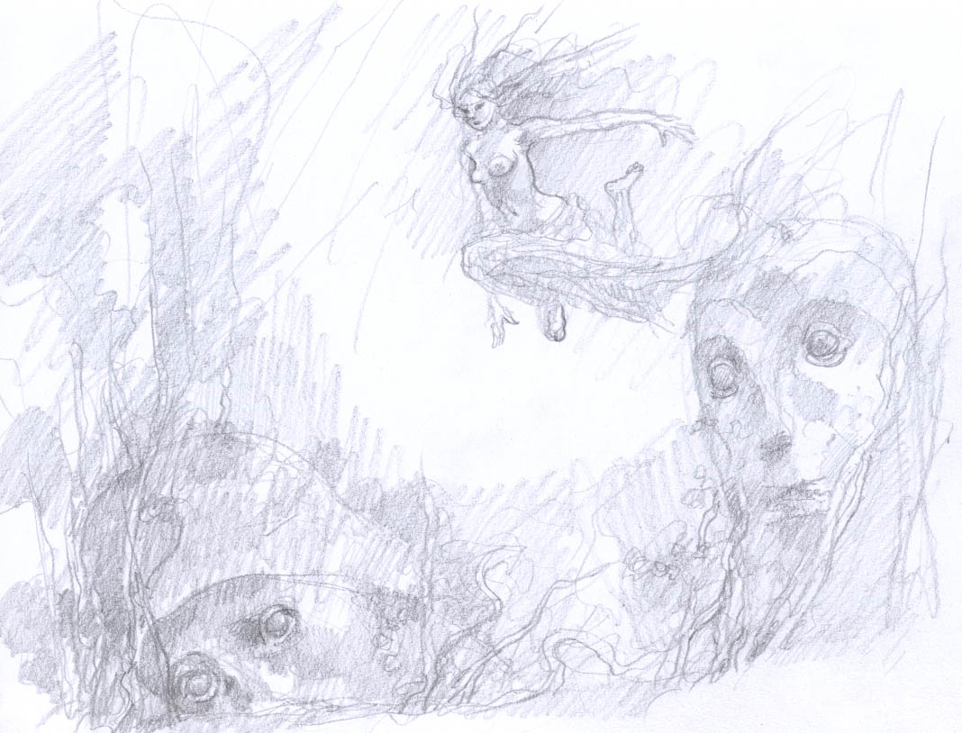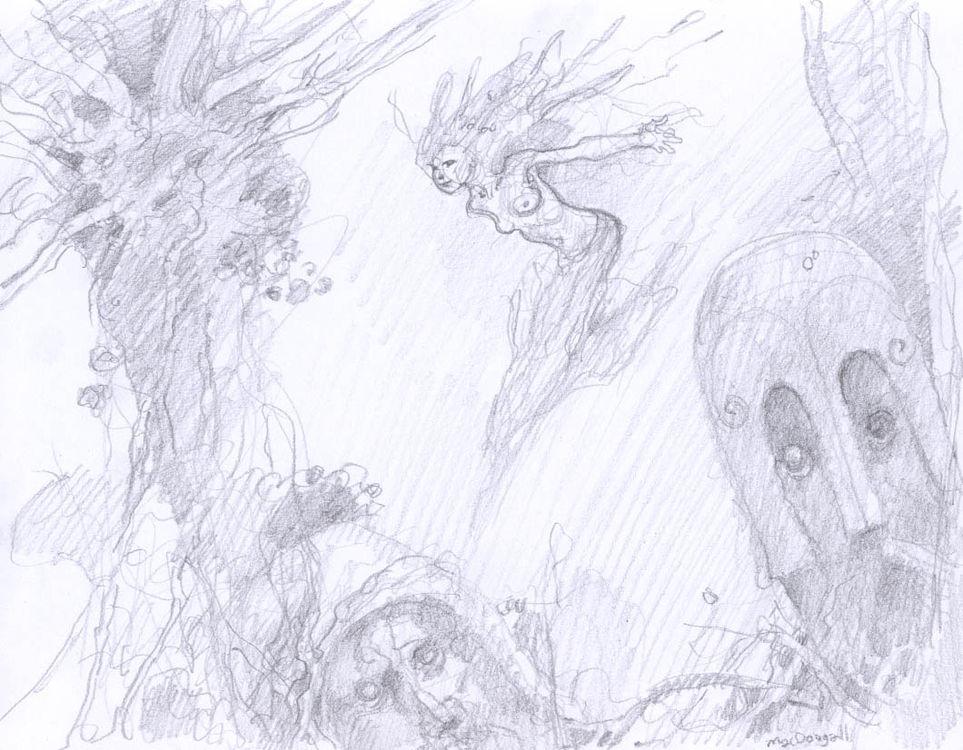 While walking through the neighbourhood the other evening, just as the sun was going down, I noticed a small flock of grackles at the top of a tall, leafless tree. They looked cold up there, huddled amid the twigs and branches. Seeing them up there with the naked tree standing out against the grey sky seemed to me to be a very Canadian scene. Not cozy or warm but cold and bleak - after winter but before spring. This put me in a nostalgic and introspective frame of mind. The kind of mood that, for me at least, will often spark an idea. It's all very spontaneous. You can't plan for this, but an idea came nevertheless and the sketches below are me attempting to work it out. A forest nymph leaping from one monumental stone head to another. I'm not sure why she is doing this, perhaps it's a game or maybe she is escaping from something unseen. At any rate, the last one is the closest to my original idea. The heads need to be bigger and she needs to be smaller.
